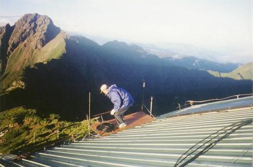 技師阿坤,爬上氣象站屋頂安裝并檢查安全工作平臺,以利工作人員 在濕滑的屋頂斜面施工。背景即為玉山主峰,雖然是六月夏季,在約 每小時來一陣的毛毛雨中,還帶有一些冰雹。